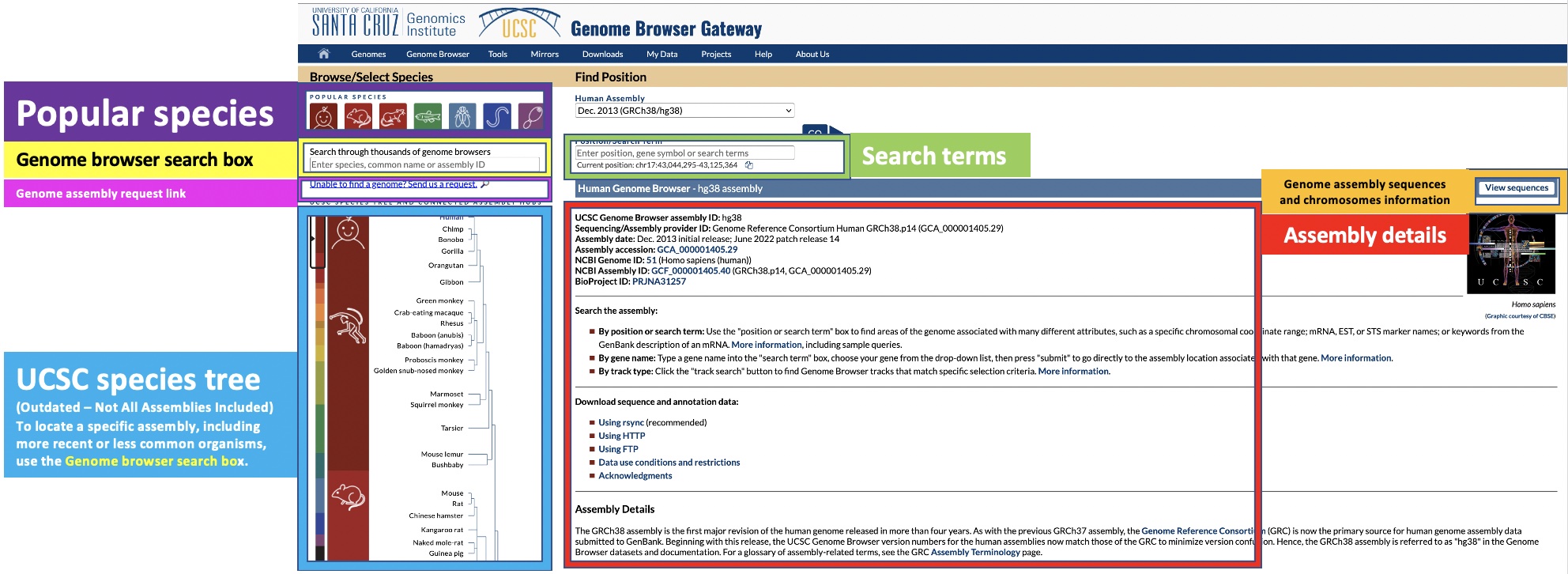 The UCSC Genome Browser Gateway page is a tool for finding and accessing genome assemblies. It features two search boxes: one for selecting an assembly and another for specifying a genomic position. This tutorial will guide you through various features of the Gateway page, including: