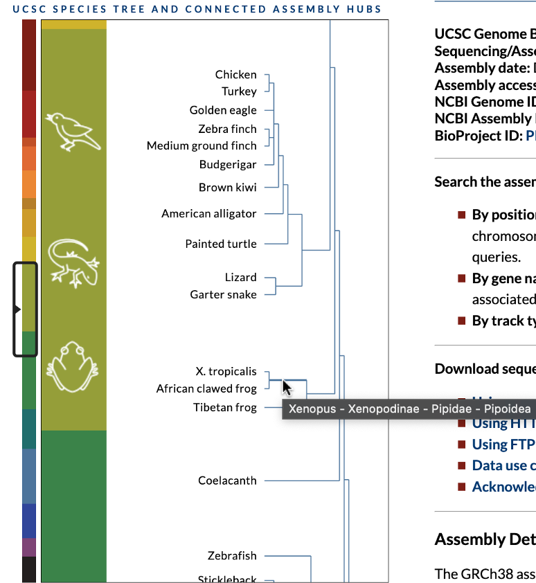 Note: The Species Tree does not include all available Genome Browser assemblies. The process of adding Genome Browsers has been streamlined, enabling rapid releases but omitting certain previous features, such as inclusion in the Species Tree. To find a specific assembly, use the assembly search box.