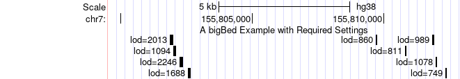 Once you have built your bigBed files, it is time to create a stanza in your hub.txt file for that track. Here is what the required settings discussed above might look like for a basic bigBed track:
