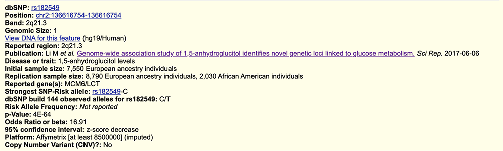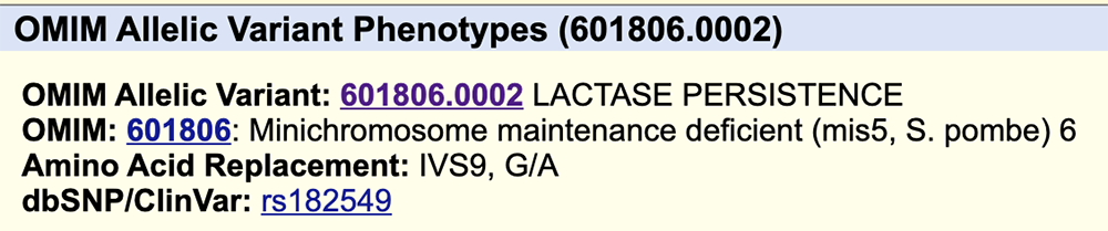 Clicking into the OMIM item labeled 601806.0001, confirms that this SNV is linked to lactase persistence (Figure 5). The dbSNP/ClinVar line corroborates that this is the same rsID, and therefore variant, seen on the GWAS track.