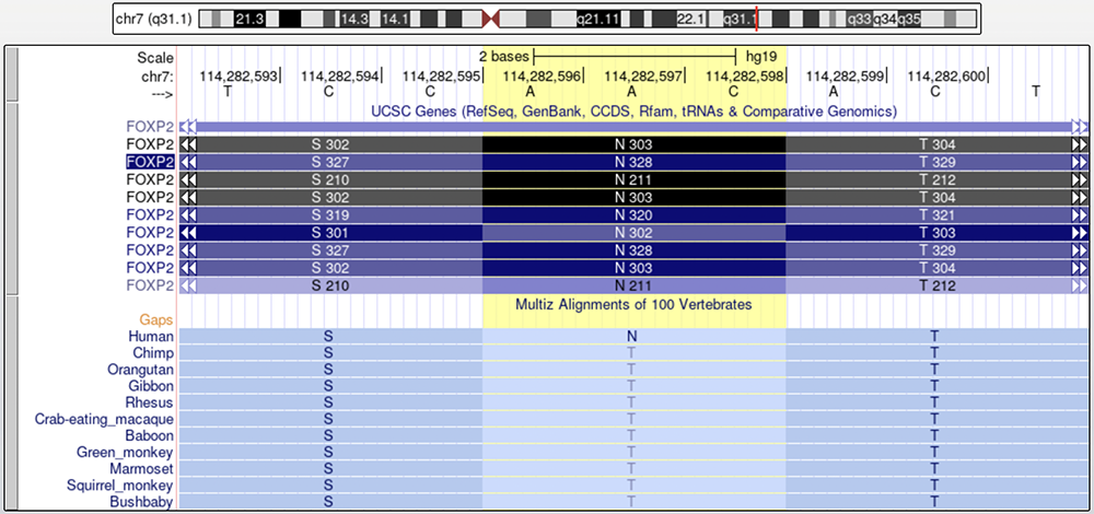Figure 3 illustrates the first of the two amino acid changes associated with development of speech in humans. The "UCSC Genes" track shows multiple isoforms, two of which have an asparagine (N) at position 303 on exon 7 (as described in Zhang et al., 2002) marked by the yellow highlight. Primates instead possess a threonine (T).