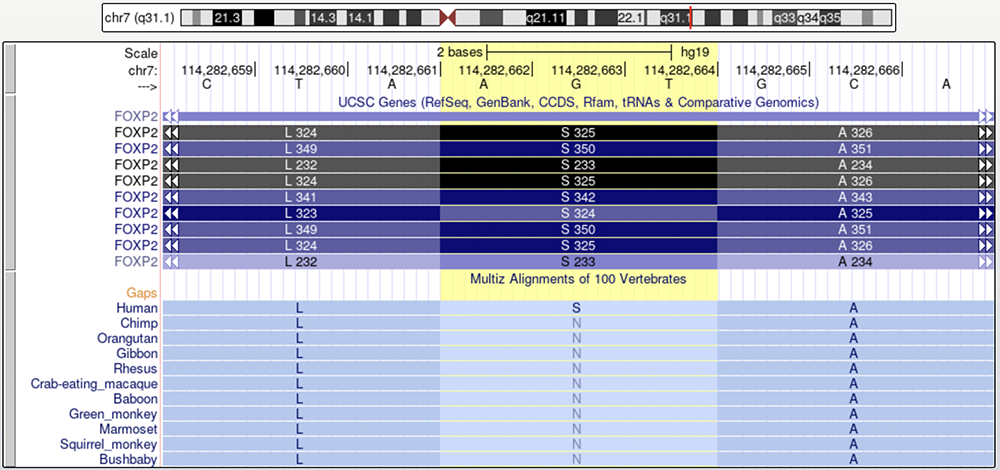 The FOXP2 gene is associated with the developmental processes of language and speech in humans. It is also thought to be a part of why humans are capable of speech while chimpanzees and other apes are not. The Genome Browser can be utilized to visualize the pathogenic components and evolutionary changes of FOXP2.