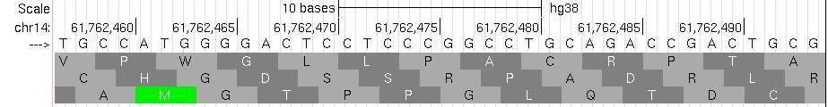 Figure 2. Zoomed-in section of the orange highlighted exon from Figure 1. Here we can see the start codon (methionine) highlighted and green and marked with the number 1 — indicating that the gene starts here. Above are the three different possible reading frames one of which matches the GENCODE V39 track.